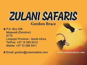 Zulani Safaris: private game farm below Soutpansberg Mountain in Limpopo. Plains game, dangerous 7 concessions. Chalets by waterhole, self-catering to fully-catered. Rondavel camp in African Village style, no electricity. Maid service, cold room provided.
